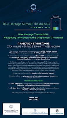 Το 1ο Blue Heritage Summit Thessaloniki, που θα πραγματοποιηθεί 17–19 Μαρτίου 2026 στη Θεσσαλονίκη, διοργανώνεται από τον οργανισμό BeyondCSR, και τελεί υπό την αιγίδα του Υπουργείου Εσωτερικών – Τομέα Μακεδονίας–Θράκης, της Περιφέρειας Κεντρικής Μακεδονίας και του Δήμου Θεσσαλονίκης.