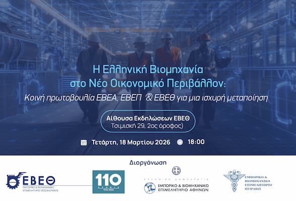 Εκδηλώσεις11 Μαρτίου, 2026Εκδήλωση “Η Ελληνική Βιομηχανία στο Νέο Οικονομικό Περιβάλλον: Κοινή πρωτοβουλία ΕΒΕΑ, ΕΒΕΠ & ΕΒΕΘ για μια ισχυρή μεταποίηση”