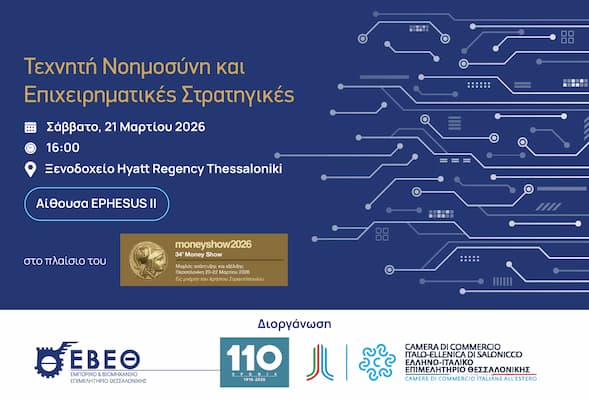 Εκδηλώσεις11 Μαρτίου, 2026Εκδήλωση “Τεχνητή Νοημοσύνη και Επιχειρηματικές Στρατηγικές” από το ΕΒΕΘ & το Ελληνο-Ιταλικό Επιμελητήριο Θεσ/νίκης, στις 21 Μαρτίου, στο 34ο Money Show