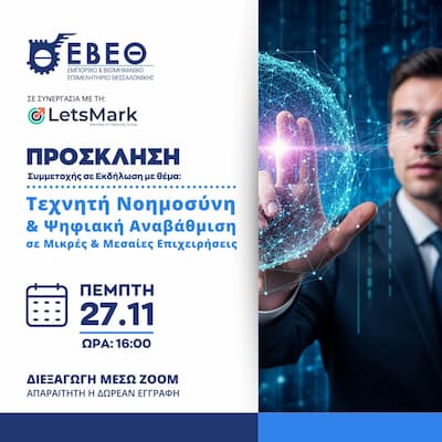 Το Εμπορικό & Βιομηχανικό Επιμελητήριο Θεσσαλονίκης, σε συνεργασία με την Εταιρεία Συμβούλων Πληροφορικής LetsMark, διοργανώνει διαδικτυακή ενημερωτική εκδήλωση με θέμα «Τεχνητή Νοημοσύνη & Ψηφιακή Αναβάθμιση σε μικρές και μεσαίες επιχειρήσεις», την Πέμπτη 27 Νοεμβρίου 2025, στις 16:00.