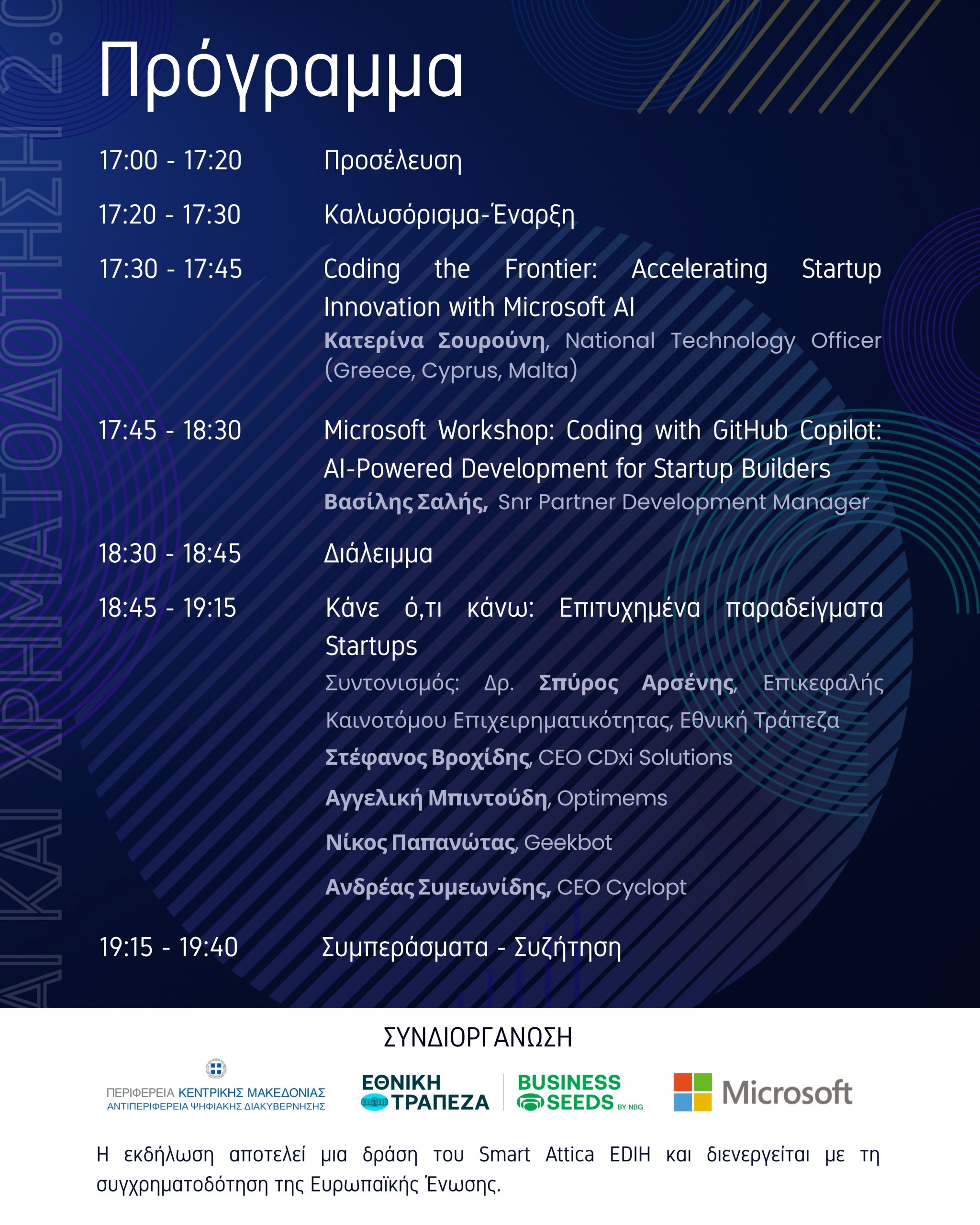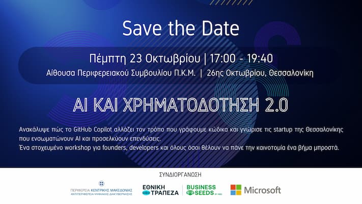 Η Περιφέρεια Κεντρικής Μακεδονίας- Αντιπεριφέρεια Ψηφιακής Διακυβέρνησης σε συνεργασία με την National Bank of Greece & Business Seeds και τη Microsoft, διοργανώνουν εκσήλωση με θέμα την Τεχνητή Νοημοσύνη και τη χρηματοδότηση.