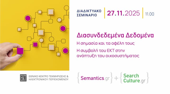 Το Εθνικό Κέντρο Τεκμηρίωσης & Ηλεκτρονικού Περιεχομένου (ΕΚΤ) σας προσκαλεί να παρακολουθήσετε το Διαδικτυακό Σεμινάριο με τίτλο «Το οικοσύστημα των Διασυνδεδεμένων Δεδομένων και οι προοπτικές ανάπτυξής του μέσω των δράσεων και των υπηρεσίων του ΕΚΤ», που θα εστιάσει στη χρησιμότητα των Διασυνδεδεμένων Δεδομένων (Linked Data ή LD) για την τεκμηρίωση του πολιτιστικού περιεχομένου, την Πέμπτη 27 Νοεμβρίου (11:00-13.00).