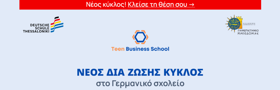 Το πρόγραμμα νεανικής επιχειρηματικότητας Teen Business School διοργανώνει το 4ήμερο, δια ζώσης Teen Business School στο Γερμανικό σχολείο από Παρασκευή 19/12/2025 έως και Τρίτη 23/12/2025 (16:00 – 20:00, εκτός Σαββάτου όταν το ωράριο θα είναι 10:00 – 14:00). Την Κυριακή 21/12/2025 δεν θα γίνουν διαλέξεις.