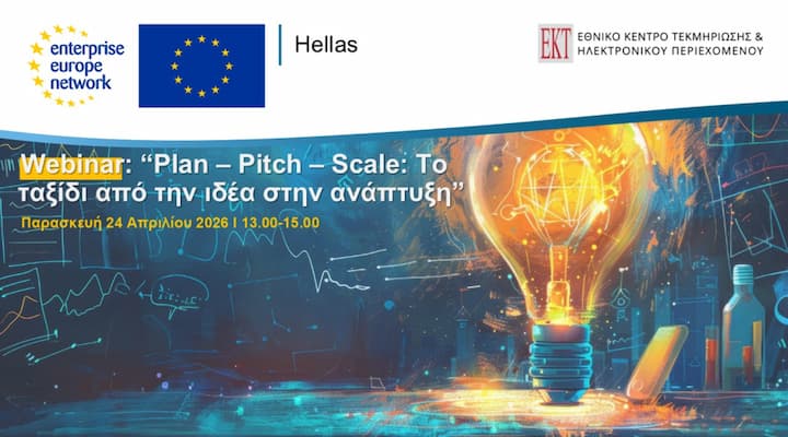 Webinar με τίτλο “Plan – Pitch – Scale: Το ταξίδι από την ιδέα στην ανάπτυξη” διοργανώνει το Εθνικό Κέντρο Τεκμηρίωσης και Ηλεκτρονικού Περιεχομένου (ΕΚΤ), συντονιστής του Enterprise Europe Network Hellas, την Παρασκευή 24 Απριλίου 2026 (ώρα 13.00-15.00).